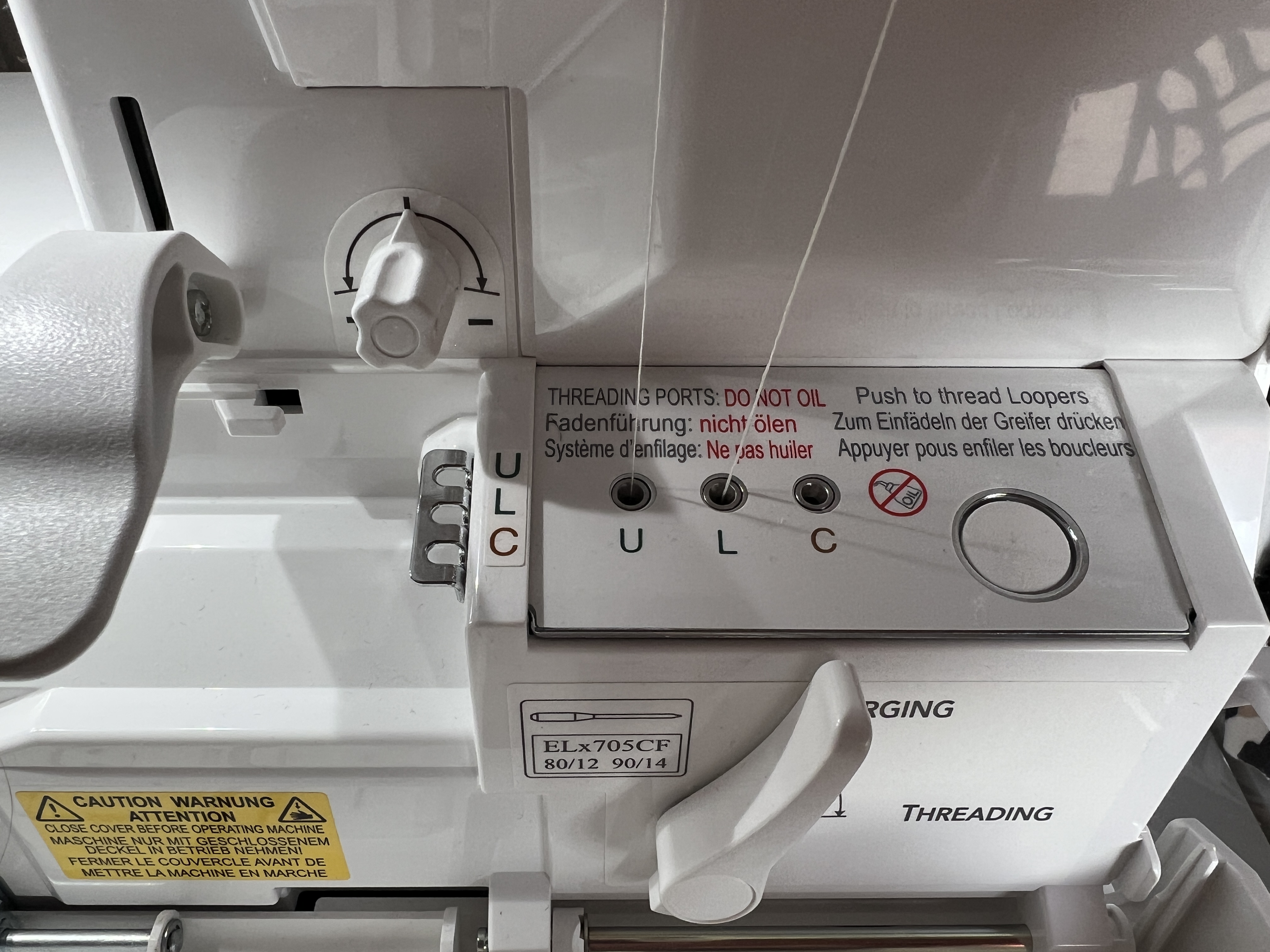 Un des aspects les plus utiles et rapides est l’enfilage à jet d’air. Avec des instructions simples directement sur la machine car tout est codée et identifié clairement sous chaque bobine et chaque trou de jet d’air. Les espaces pour les aiguilles à utiliser sont aussi clairement identifiés. Une fois qu’on a réussi, c’est un jeu d’enfant de faire l’enfilage de cette machine pour une ou l’autre de ses capacités.