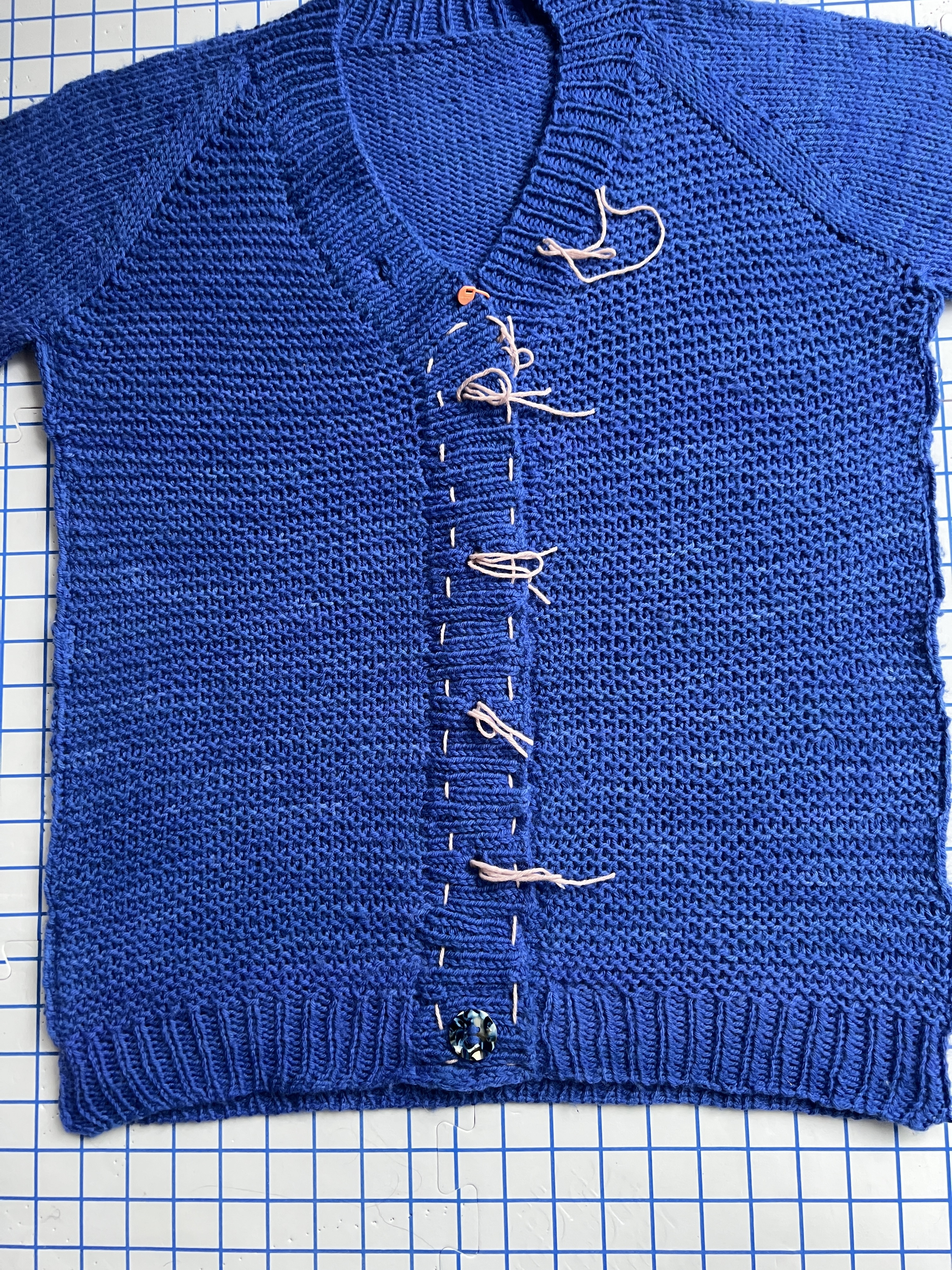 Après un passage au blocage, elle est franchement à mon goût! J’ai faufilé mes bandes devant ensemble à la main et fait des points à bâtir directement sur le tricot, directement sur le tapis à bloquer pour m’assurer que je poserais les boutons bien enlignés avec les boutonnières. On voit que la couturière en moi ressort toujours un peu. 😂