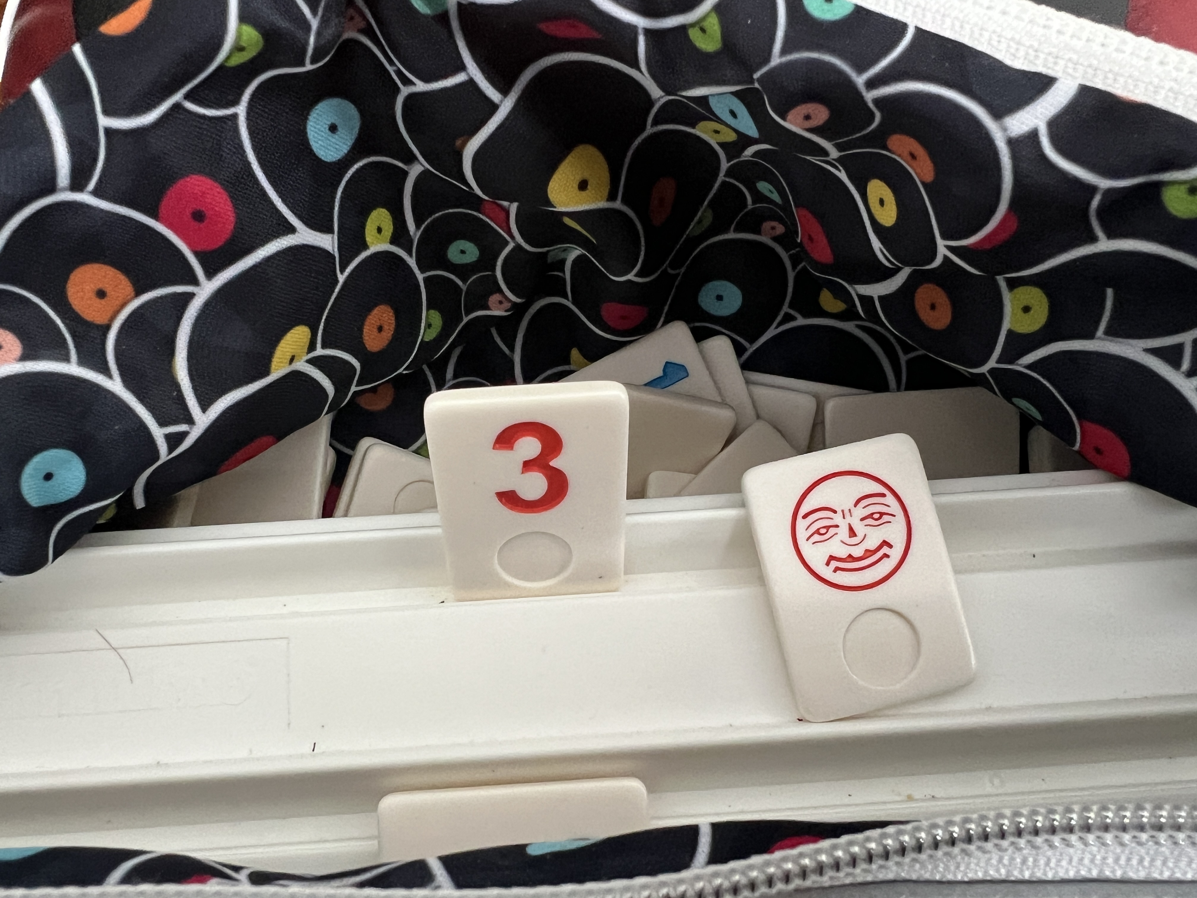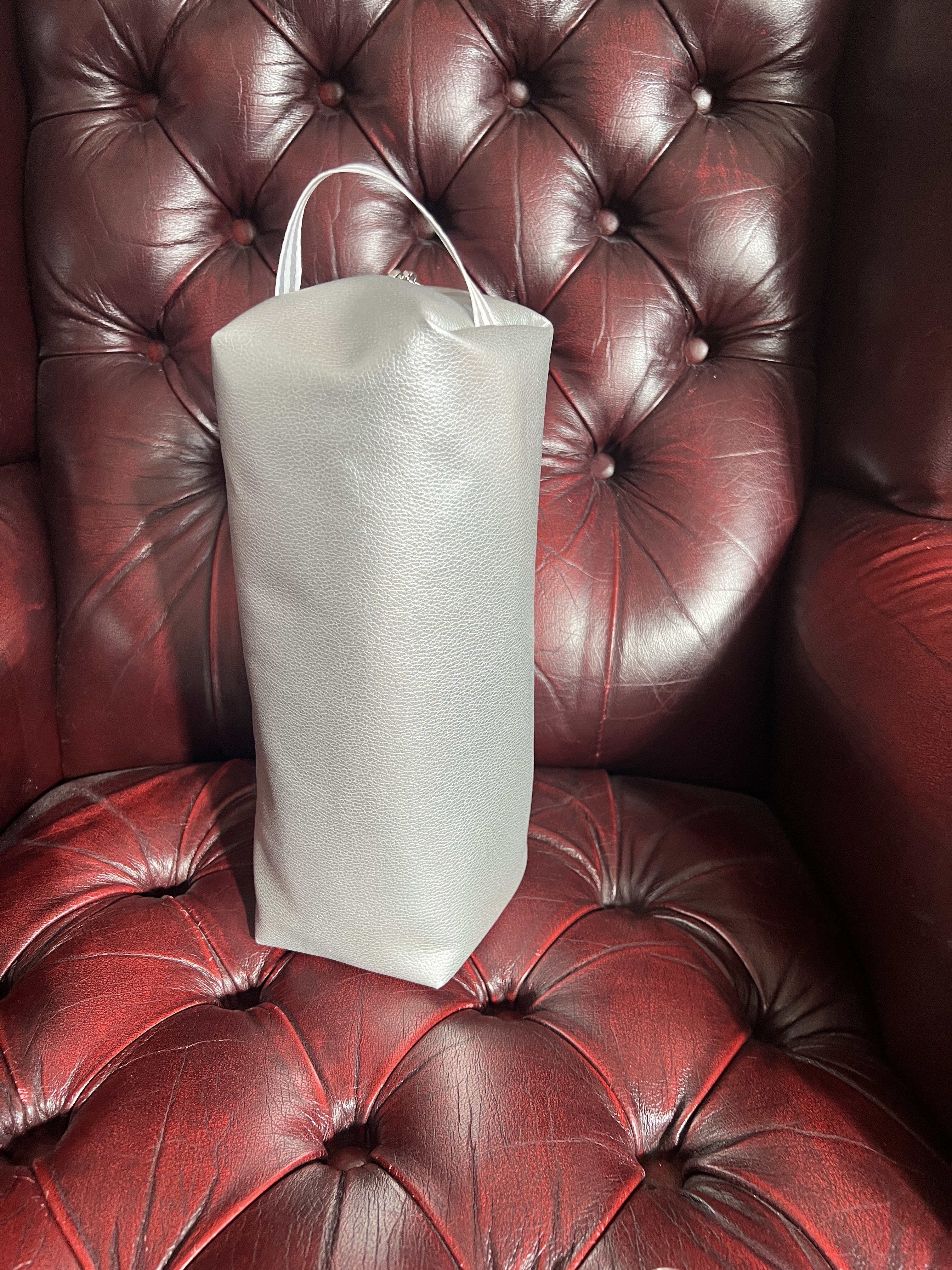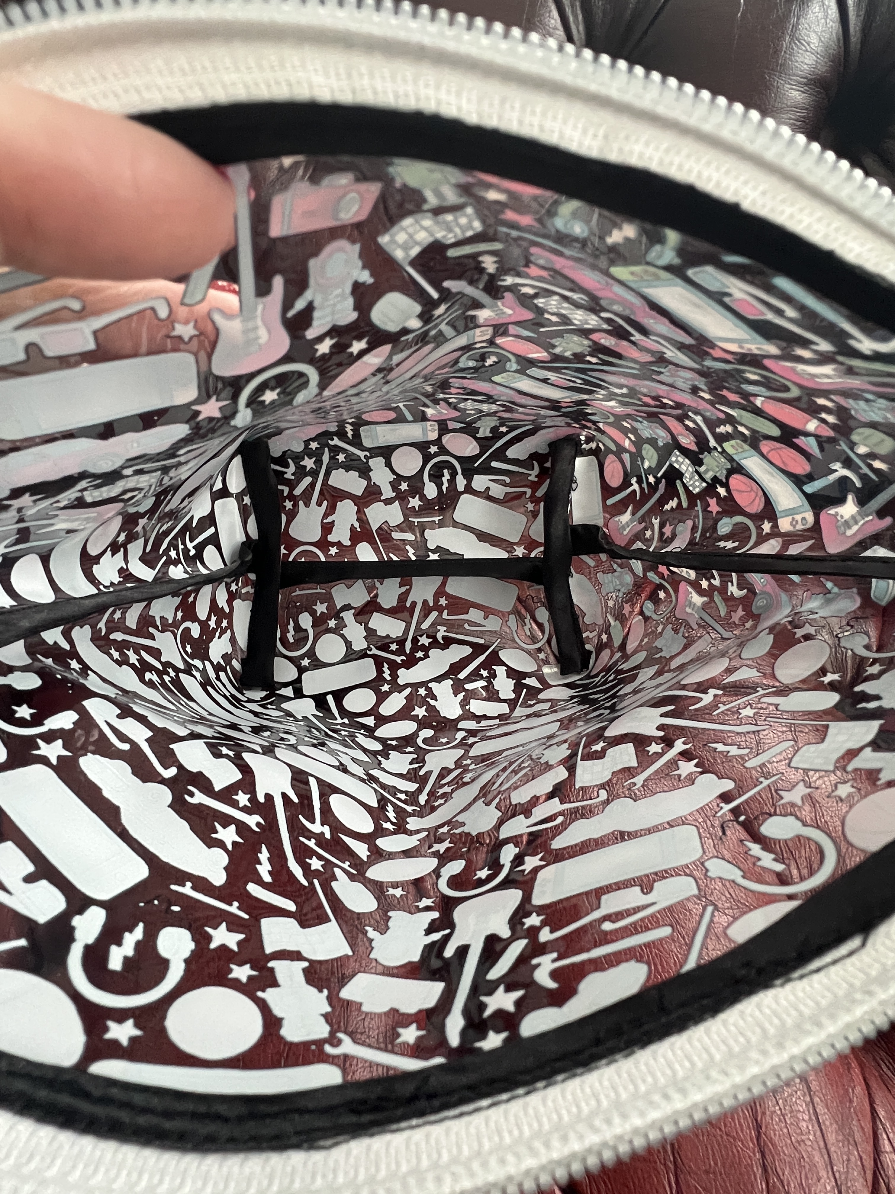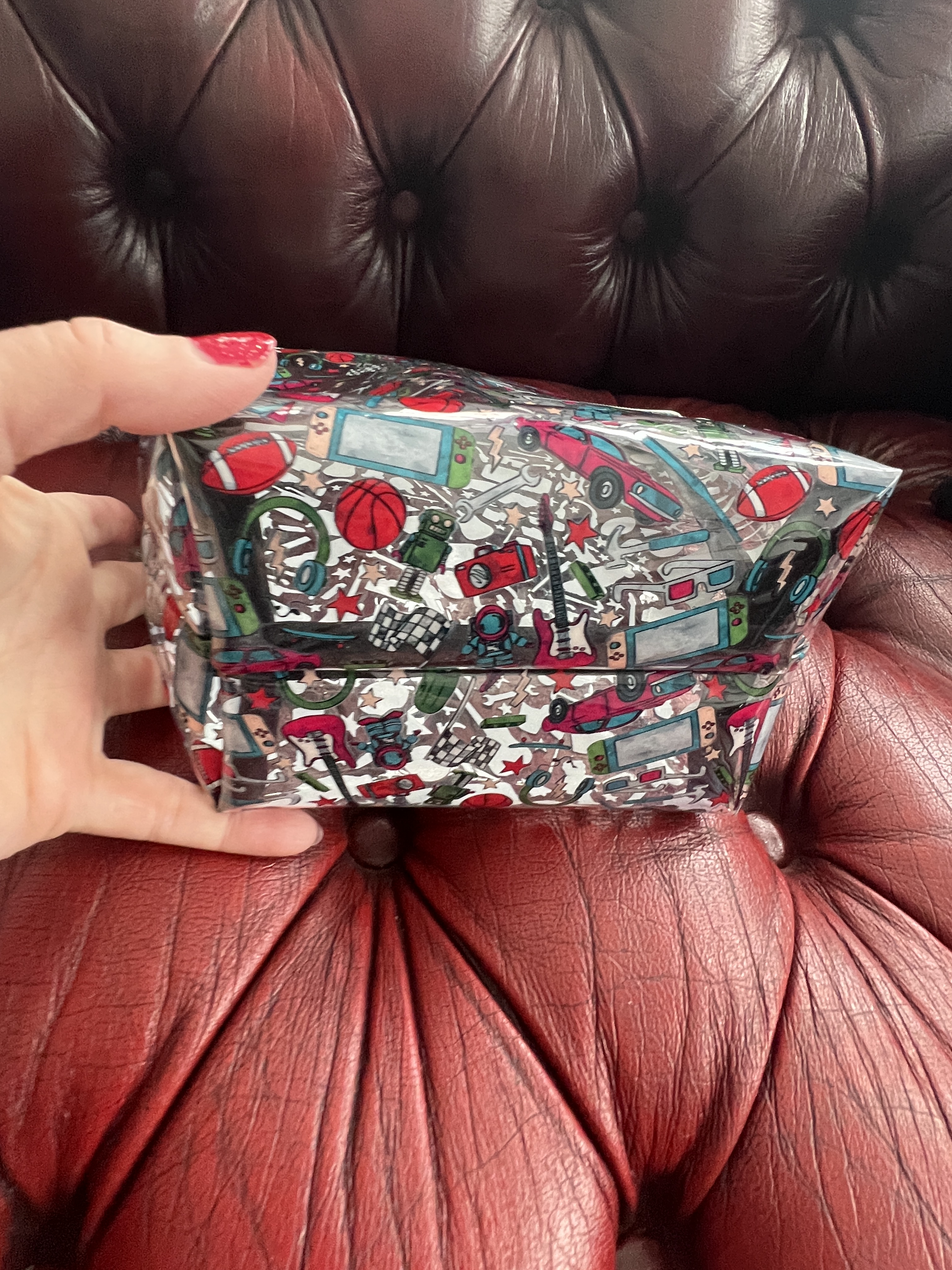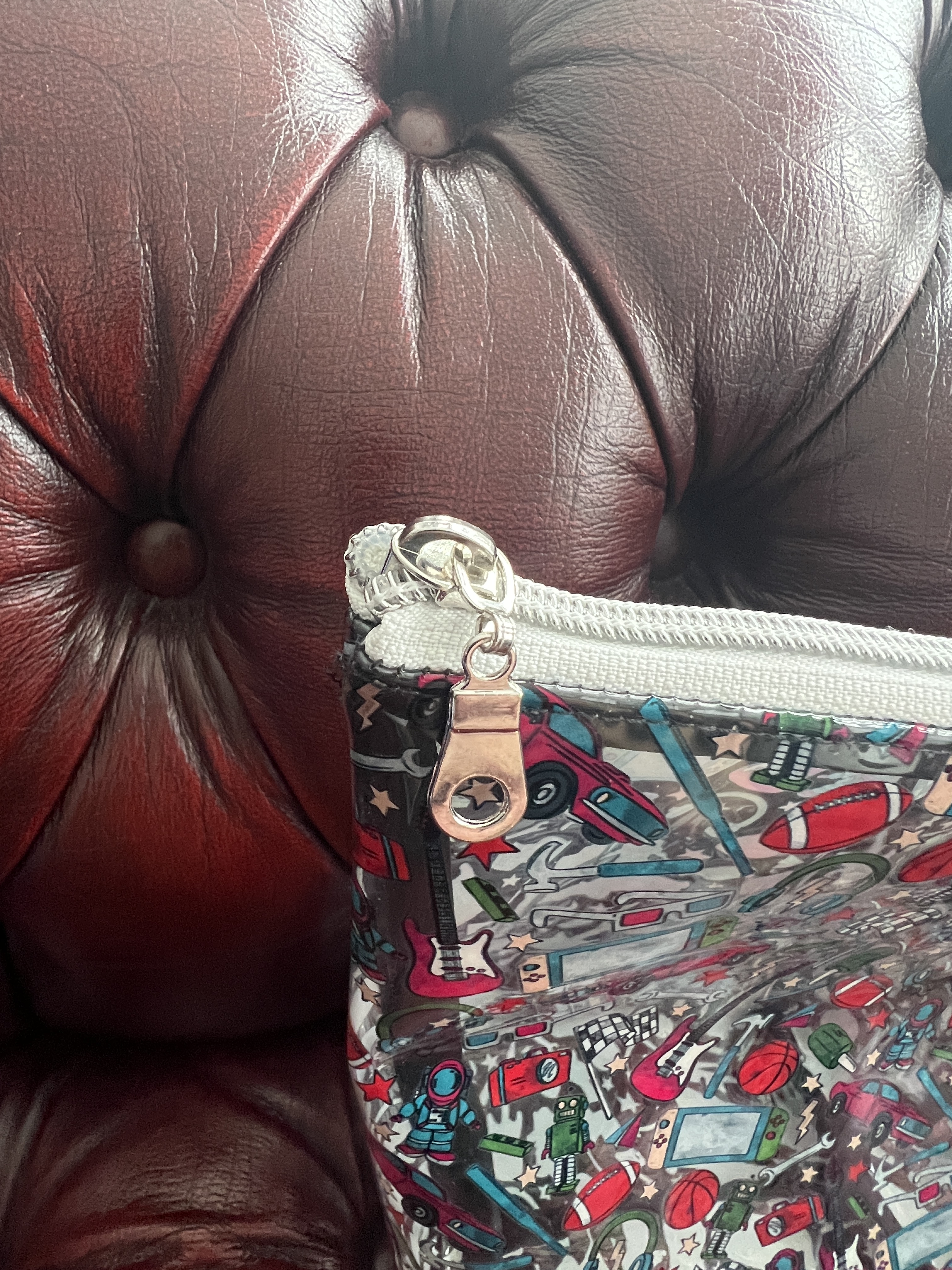 Ce sac en cuirette est maintenant plus solide et plus épais car coussiné avec de l’ouatine de coton dense, je l’ai aussi équipé d’une fermeture éclair robuste. Entièrement doublé d’une jolie doublure en Pul alimentaire (tissu utilisé pour les couches lavables au Québec car respirant même si imperméable) aux motifs de microsillons qui ont beaucoup plu à Alainclui! Il est très beau ce sac de jeux et nous avons de la place pour y rajouter aussi un de nos jeux de cartes préférés le jeux Five Crowns pour notre voyage.