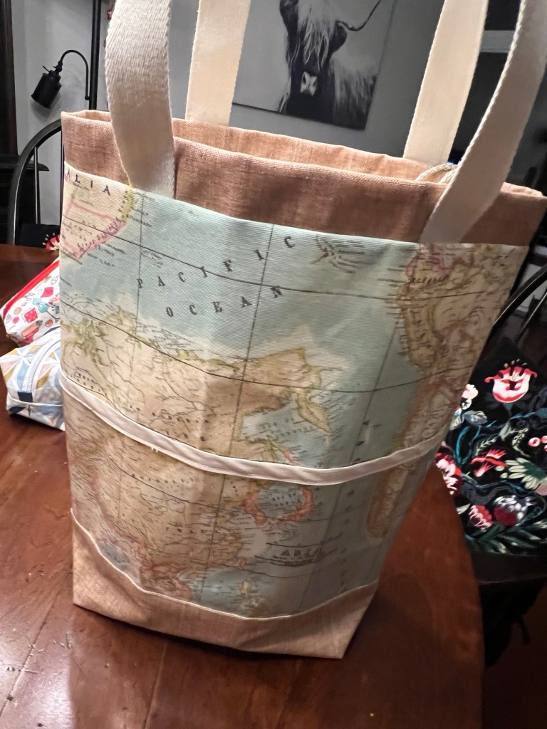 Malorie, la fille d’Alainclui voyage beaucoup et trouvait mon sac à tricot avec un tissu carte du monde très à son goût!