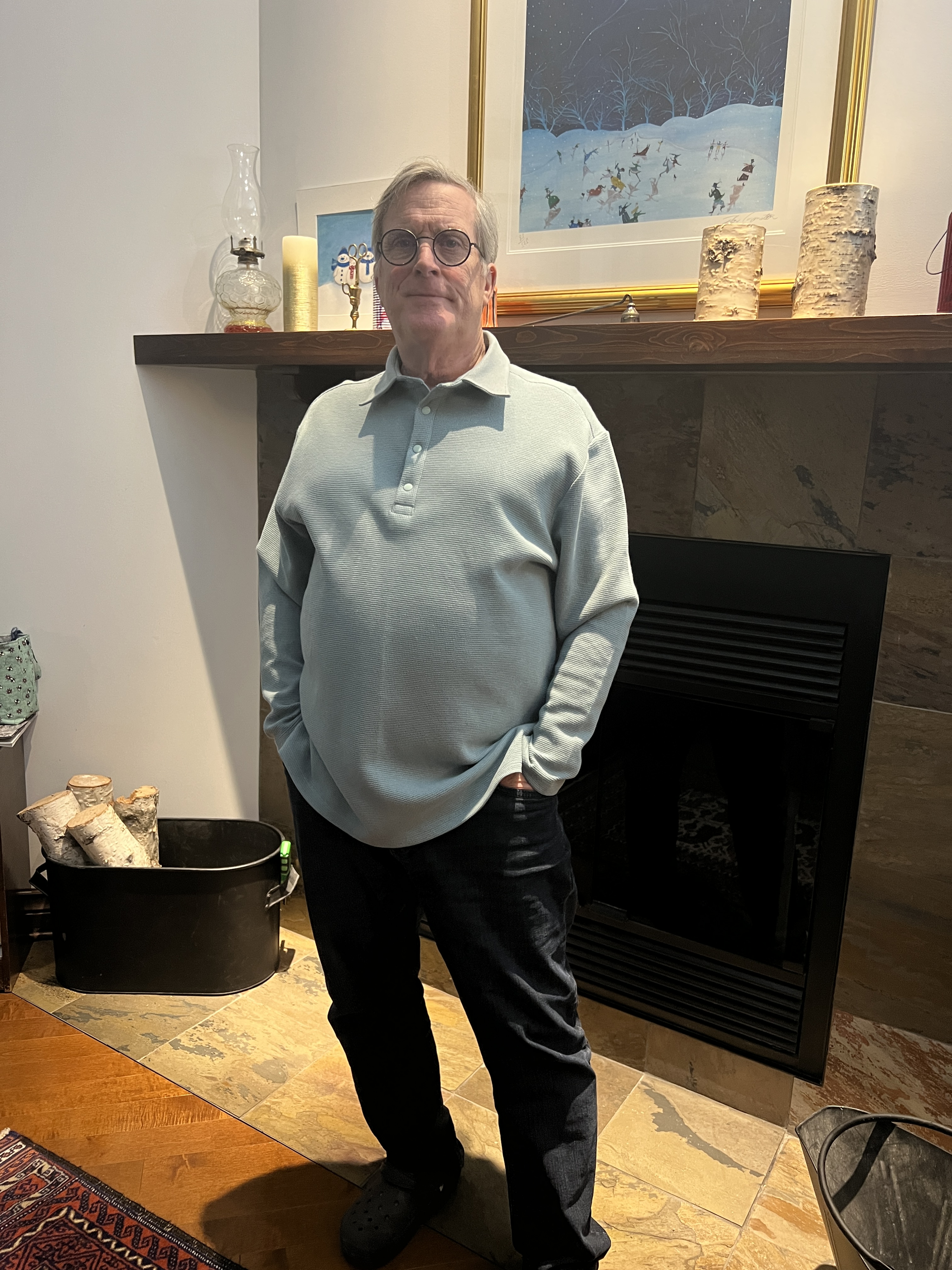 Alain n’a pas voulu que je coupe celui-ci, donc je vais voir plus tard, mais il risque de dépasser ses manteaux! La couleur vert d’eau plutôt douce lui va bien avec ses cheveux grisonnants.