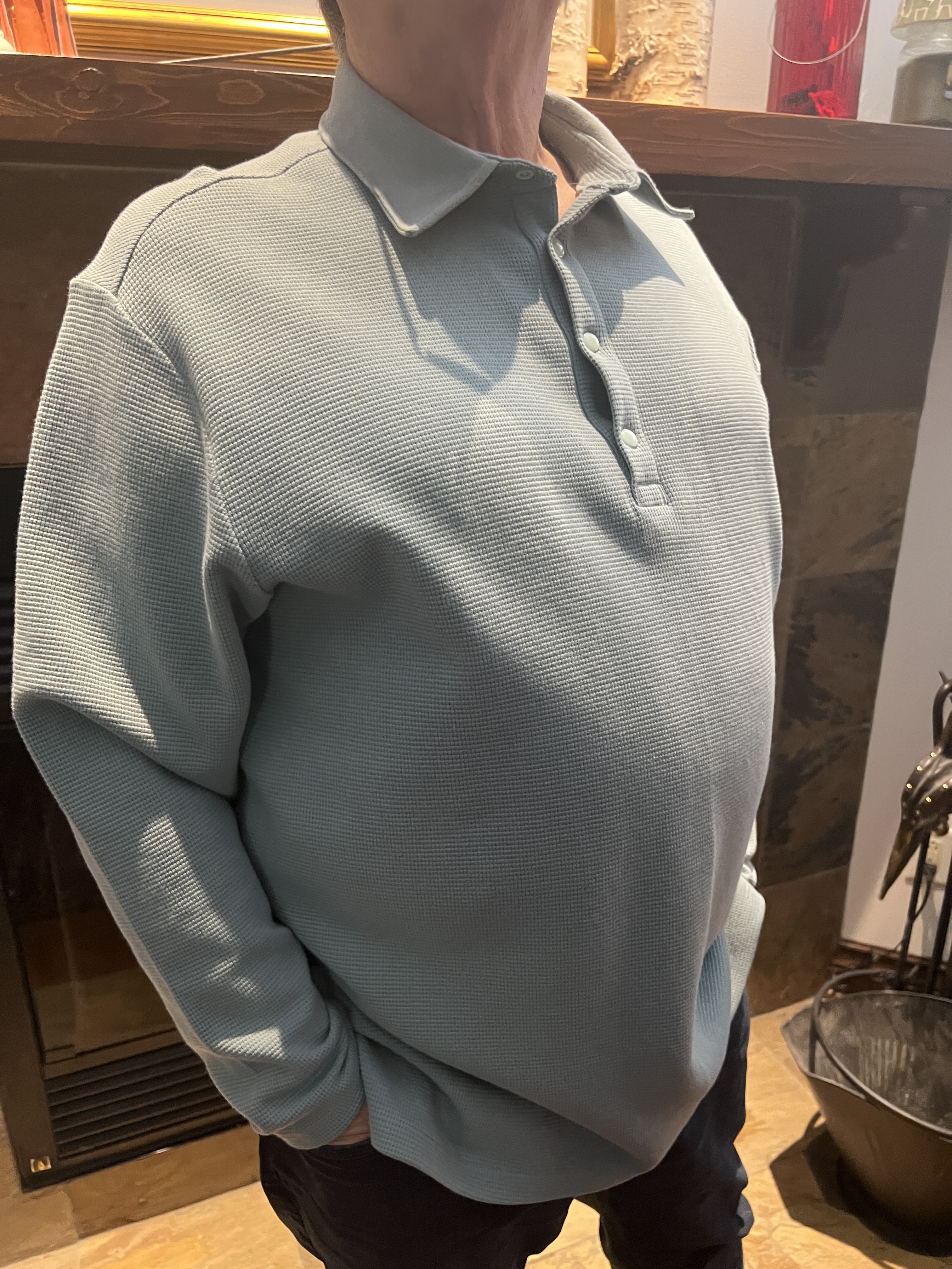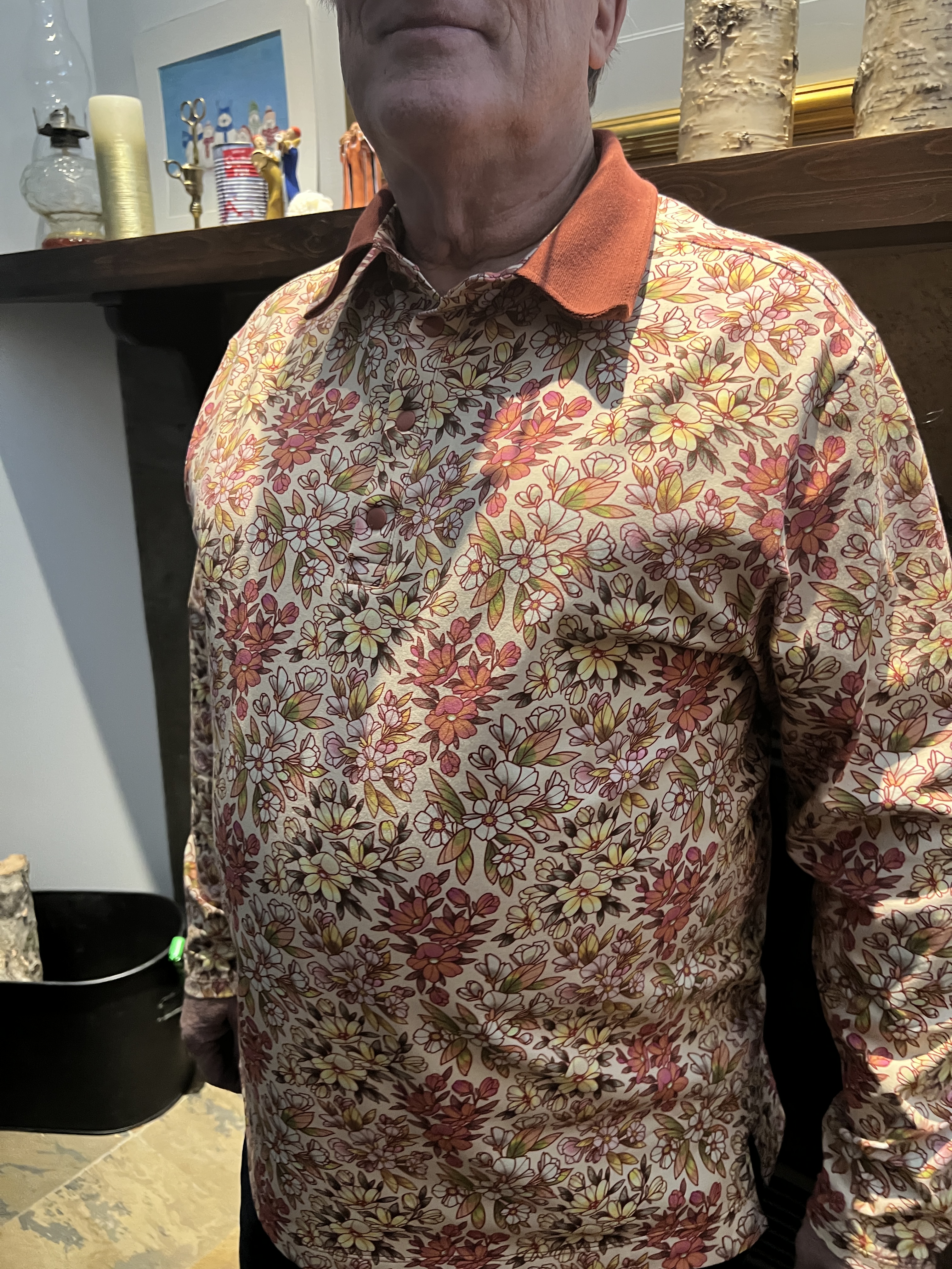 Lorsque j’ai coupé à la chaîne mes 15 morceaux, j’ai aussi coupé ce polo moelleux pour Alain. Dédié, au début, à un hoody simple col rond et bord côte classique, j’ai, à la dernière minute, décidé d’en faire un vêtement plus chic, soit aussi un polo, en utilisant le bord côté assorti pour le col. Ce tissu est très épais et j’ai préféré utiliser au minimum les surpiqûres car avec la texture, elles ne sortaient vraiment pas bien même si elles étaient droites. Ce polo fut cousu avant l’autre ci-haut fleuri et j’ai bien fait car j’ai pu corriger certaines petites choses, dont un peu la longueur sur le 2e.