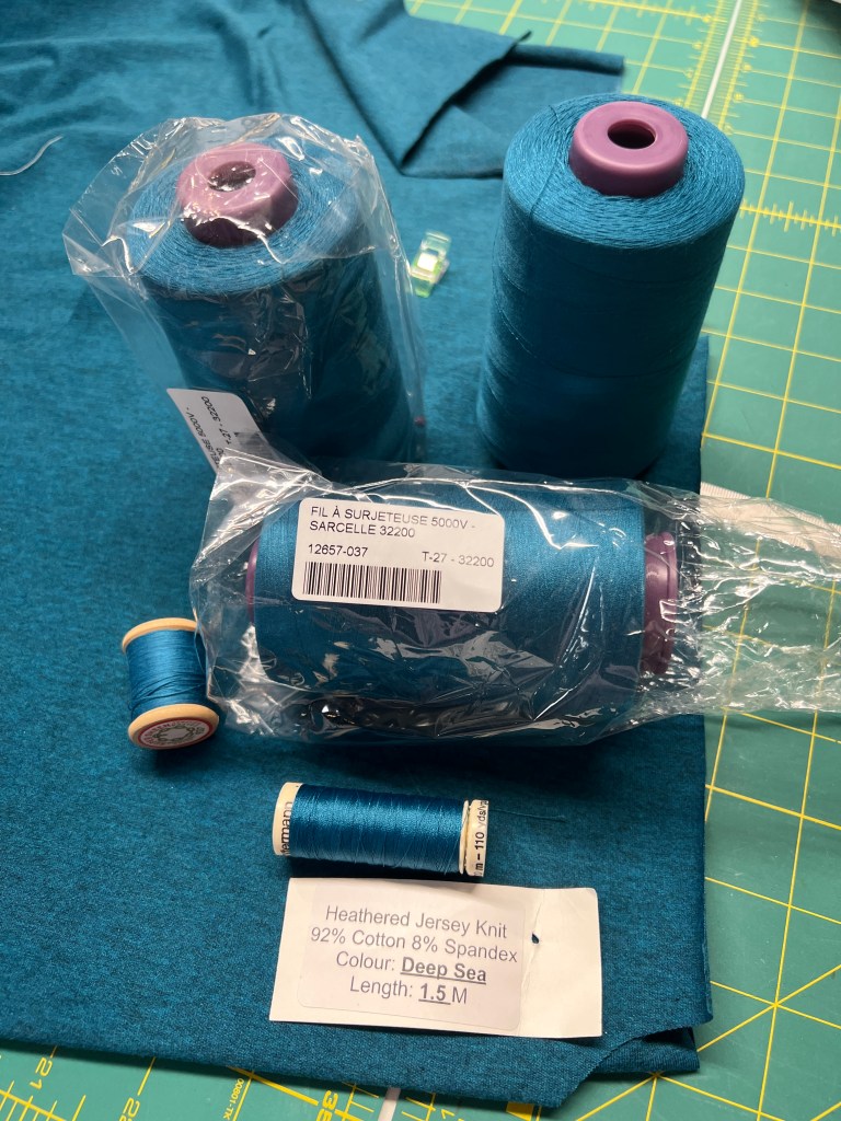Dans le cahier des charges d’@alainclui, il y avait un hoodie léger, comme il appelé ceux qui ne sont pas en molleton ou même en French Terry, mais juste en coton lycra, mais d’un poids plus important. J’avais dans ma réserve depuis très longtemps ce tissu de @thefabricsnob et le tissu de côtes qui s’agençait avec. Le cahier de charge demandait aussi un hoody large, mou et capuchon pas trop épais ou lourd. J’ai donc mis qu’une parementure incluse dans la première version du patron au lieu de doublé entièrement le capuchon, ce qui permet aussi ce patron d’Hubert Men’s Hoodie Sewing Pattern Wardrobe By Me. Jours de chance, en plus j’ai trouvé chez Club Tissus @club_tissus, la couleur de fil à surjeuteuse parfaite pour aller avec mon tissu. Ce bleu Sarcelle chiné noir léger est franchement de toute beauté pour mon homme.