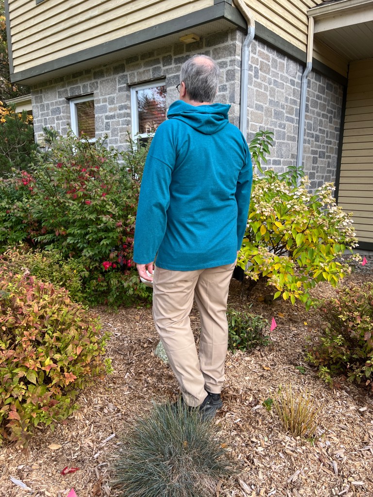 Pour le patron, ce n’est pas pour débutant, même si le modèle semble simple. Il y a peu de crans d’assemblages et les instructions sont assez minces. Il y a eu mise à jour du patron et des instructions, mais surprise, parmi les corrections, il y a aussi certains points essentiels aux instructions qui n’apparaissent plus dans la mise à jour. J’ai donc utilisé les 2 versions afin de comprendre la marche à suivre! J’ai aussi fait une amélioration notable, en y insérant une bande de col en jersey dans le même tissu contrastant plus extensible, dont j’ai coupé à 85% de la longueur de l’encolure et cousu en plus de la capuche au cou, et cela tient mieux le tout à ce niveau. J’ai aussi omis la poche ventrale, les bandes de tricot du bas des manches et au bas du hoody. Le sourire de Monsieur dit tout ! 😂