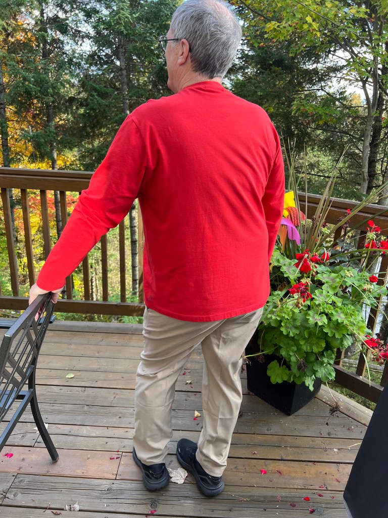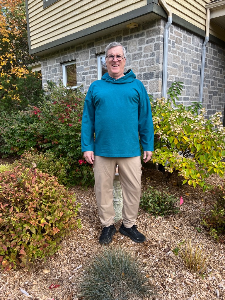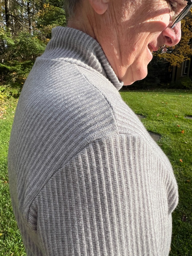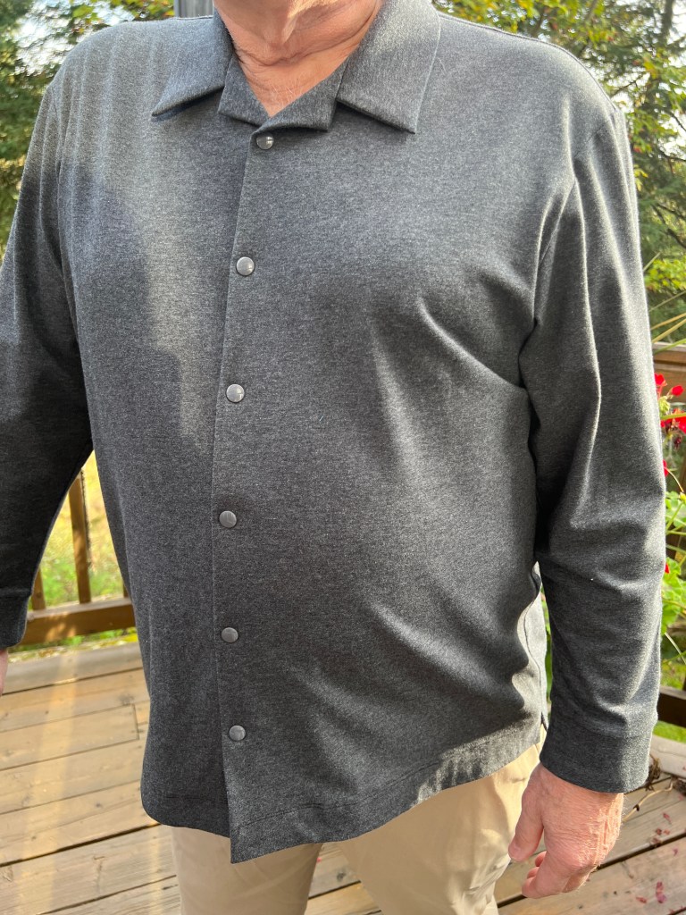 Donc, fini aussi les t-shirts en coton-lycra avec des dessins rigolos mais souvent enfantins. Mais, il aime bien porter ce tissu le jour pour le confort et pour aller prendre ses marches, donc, j’en ai cousu en couleur unie et variée. Rouge feu, bleu ciel et un gris chiné viendront rejoindre le rouge bourgogne, bleu marin et les cols mock en tricots de côtes cousus l’an dernier. Toujours avec le même patron Jalie 2918 que j’ai encore ajusté, car le « Bay Window » a pris encore un peu d’ampleur. Ils portent maintenant du extra-large, soit « CC » selon cette marque, avec une mesure de bras de 61 cm, (il aime ses manches très longues mais en fait, il a les bras courts!) ) Et j’ai allongé le centre du devant de 1,5 cm pour compenser pour la rondeur du bedon qui fait rebiquer celui-ci. J’ai aussi rehaussé l’encolure pour mieux cacher la base du cou sur la base de ce nouveau patron agrandi, mais je crois pas assez suite aux photos présentées. J’ai réduit aussi la bande d’encolure, ce qui la tient plus près du cou, pour des chandails d’hiver.