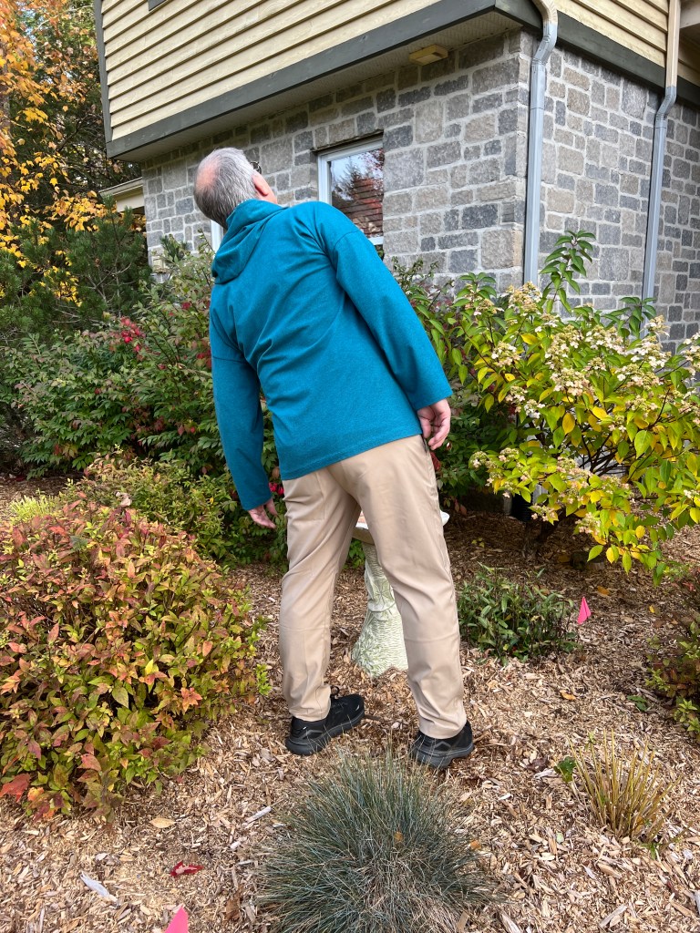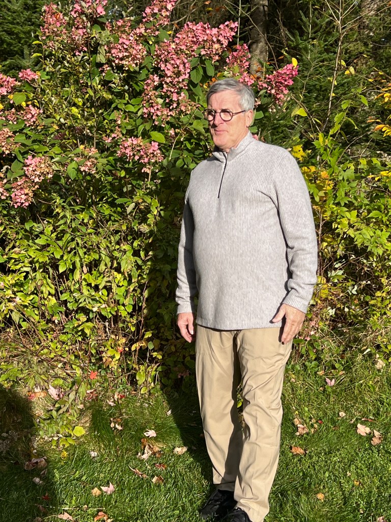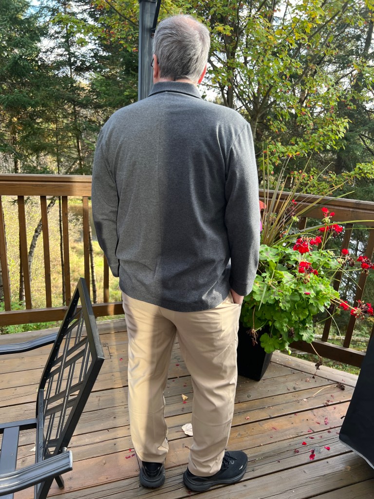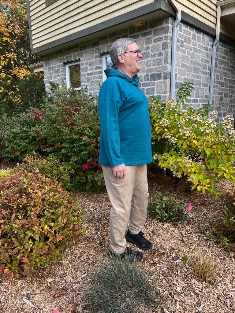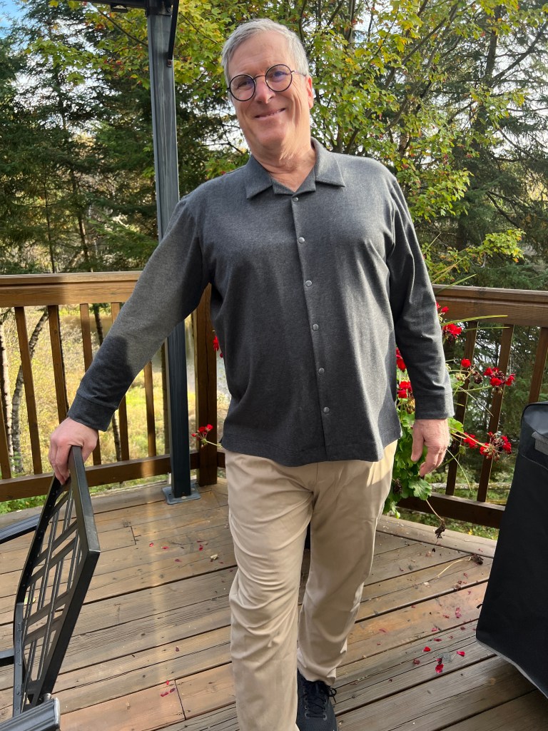 Donc, fini aussi les t-shirts en coton-lycra avec des dessins rigolos mais souvent enfantins. Mais, il aime bien porter ce tissu le jour pour le confort et pour aller prendre ses marches, donc, j’en ai cousu en couleur unie et variée. Rouge feu, bleu ciel et un gris chiné viendront rejoindre le rouge bourgogne, bleu marin et les cols mock en tricots de côtes cousus l’an dernier. Toujours avec le même patron Jalie 2918 que j’ai encore ajusté, car le « Bay Window » a pris encore un peu d’ampleur. Ils portent maintenant du extra-large, soit « CC » selon cette marque, avec une mesure de bras de 61 cm, (il aime ses manches très longues mais en fait, il a les bras courts!) ) Et j’ai allongé le centre du devant de 1,5 cm pour compenser pour la rondeur du bedon qui fait rebiquer celui-ci. J’ai aussi rehaussé l’encolure pour mieux cacher la base du cou sur la base de ce nouveau patron agrandi, mais je crois pas assez suite aux photos présentées. J’ai réduit aussi la bande d’encolure, ce qui la tient plus près du cou, pour des chandails d’hiver.