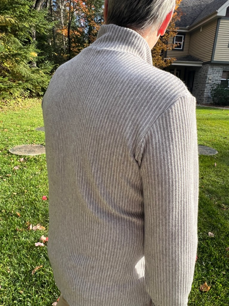 Il faut savoir aussi qu’il a les bras courts et j’ai enlevé 4cm à la ligne de coupe prévue pour cet ajustement. Ce ne fut pas assez, je crois lui soustraire un autre 3cm pour la prochaine.