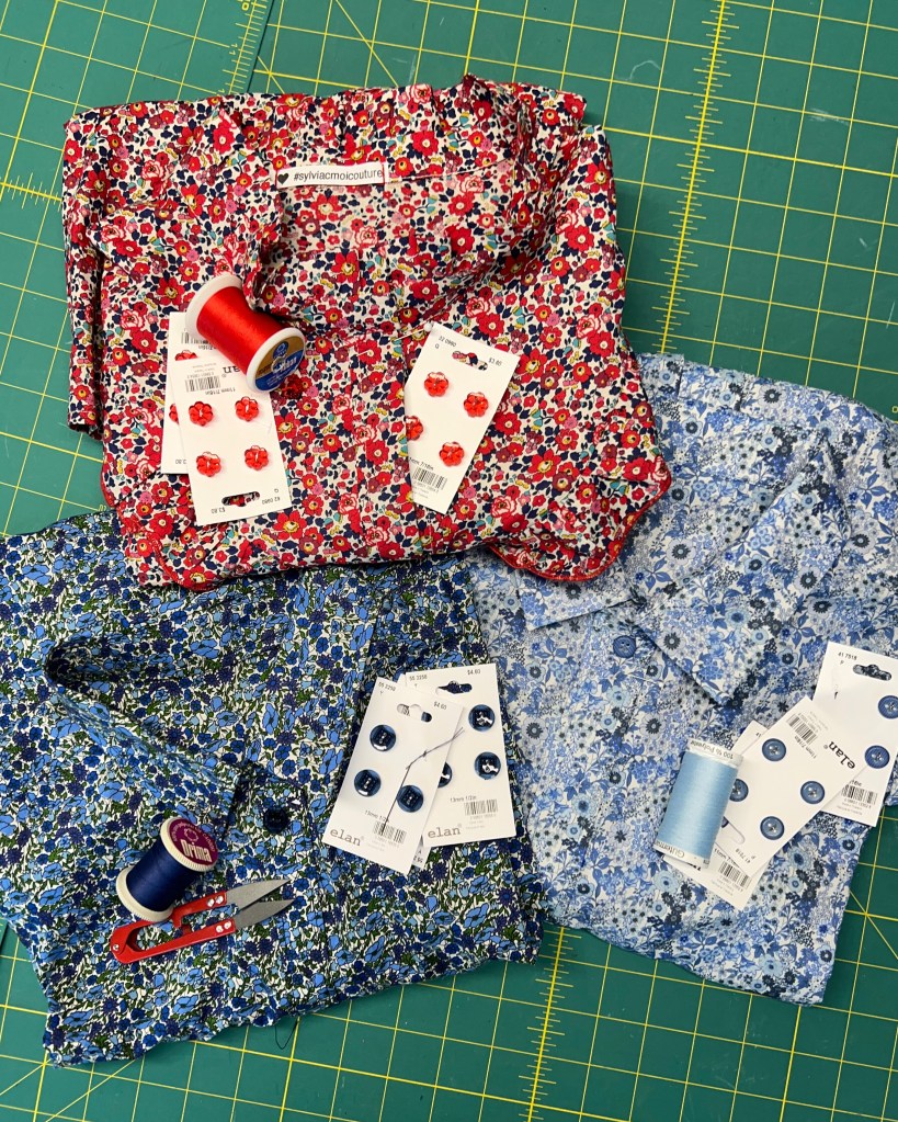 Voici les 3 tissus avec leurs boutons respectifs achetés chez Club Tissus Laval. Ils sont magnifiques et magnifiquement assortis à chacun des tissus! 🥰 Mais… c’est long, 30 boutonnières à faire et 30 boutons à poser! 🤪 Une chance qu’il y a eu soirée d’élection américaine au menu ce soir-là! 😂