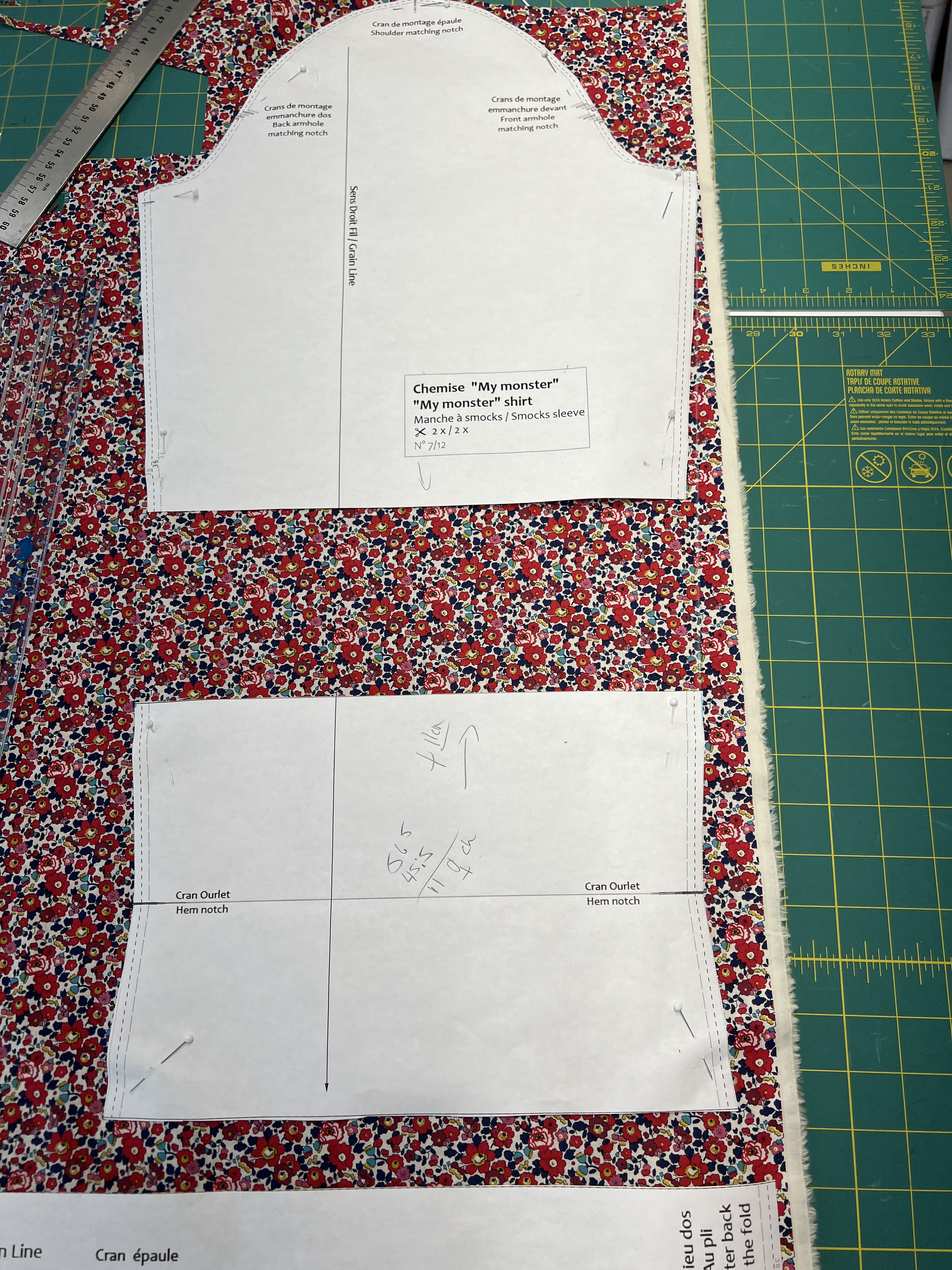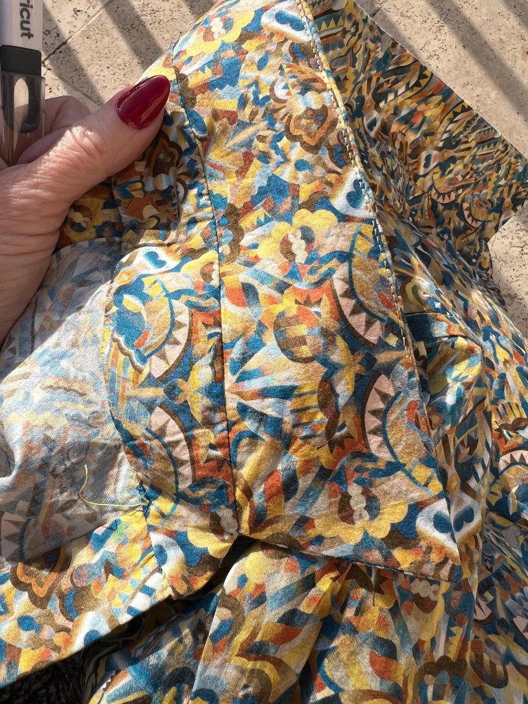 J’ai attaqué (C’est le bon mot quand on pense à l’outil « aka » les ciseaux) qu’on utilise!) Mes tissus imitations Liberty achetés lors de mon dernier voyage à Montpellier l’an passé.