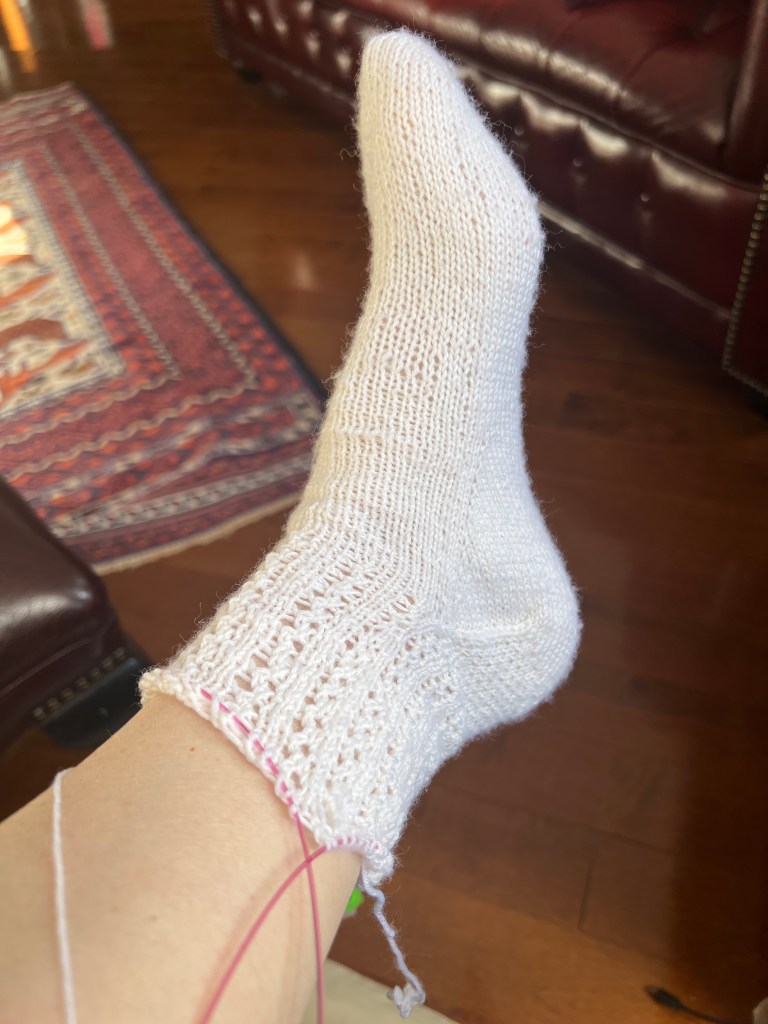 J’ai reçu, en cadeau de ma fille pour mon anniversaire, de la laine à bas de chez Laines Biscotte, elles sont trop belles et je ne sais laquelle choisir pour apporter en voyage, d’ailleurs, mes jolies beiges pâle en dentelle sont presque terminées. J’adore le rendu à date, mais je crains qu’avec la dentelle qu’elles ne soient pas très chaudes pour mes chevilles cet hiver! (Le Gars qui Tricote et Dentelle du livre de @CloTricot) avancent à pas de tortue car le peu de temps libre qu’il me reste, je couds! Mais voici une photo récente de ceux sur mes aiguilles en ce moment, et je retarde de finir les côtes afin de les faire durant le vol en avion!