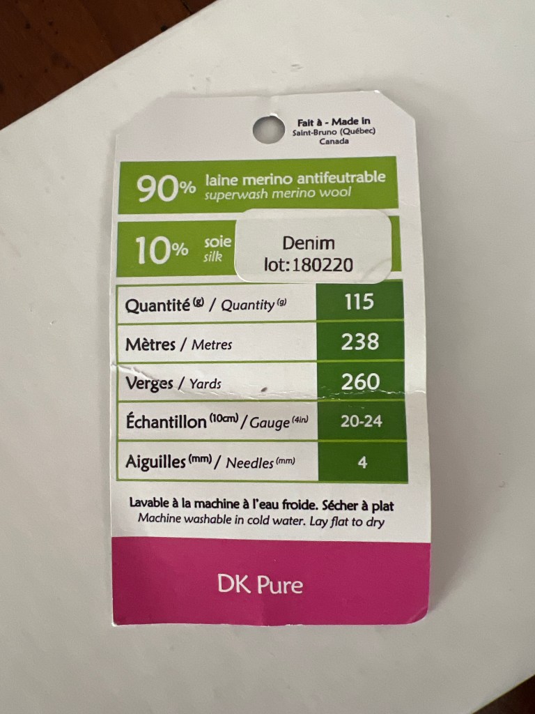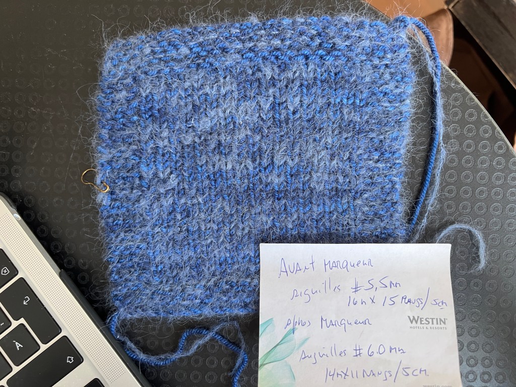 J’ai aussi mis en cake de la belle laine DK Pure de Biscotte en mérinos et soie avec celle en format dentelle (Lace) en Bébé Alpaca suri et soie de Ma Laine Maison @malainemaison, que je vais tricoter ensemble. Cela me donne un fils Worsted, je crois. J’ai fait un échantillon avec des aiguilles 5,5 et en 6 et cela me donne en 14m pour 22 rangs pour 10 cm2