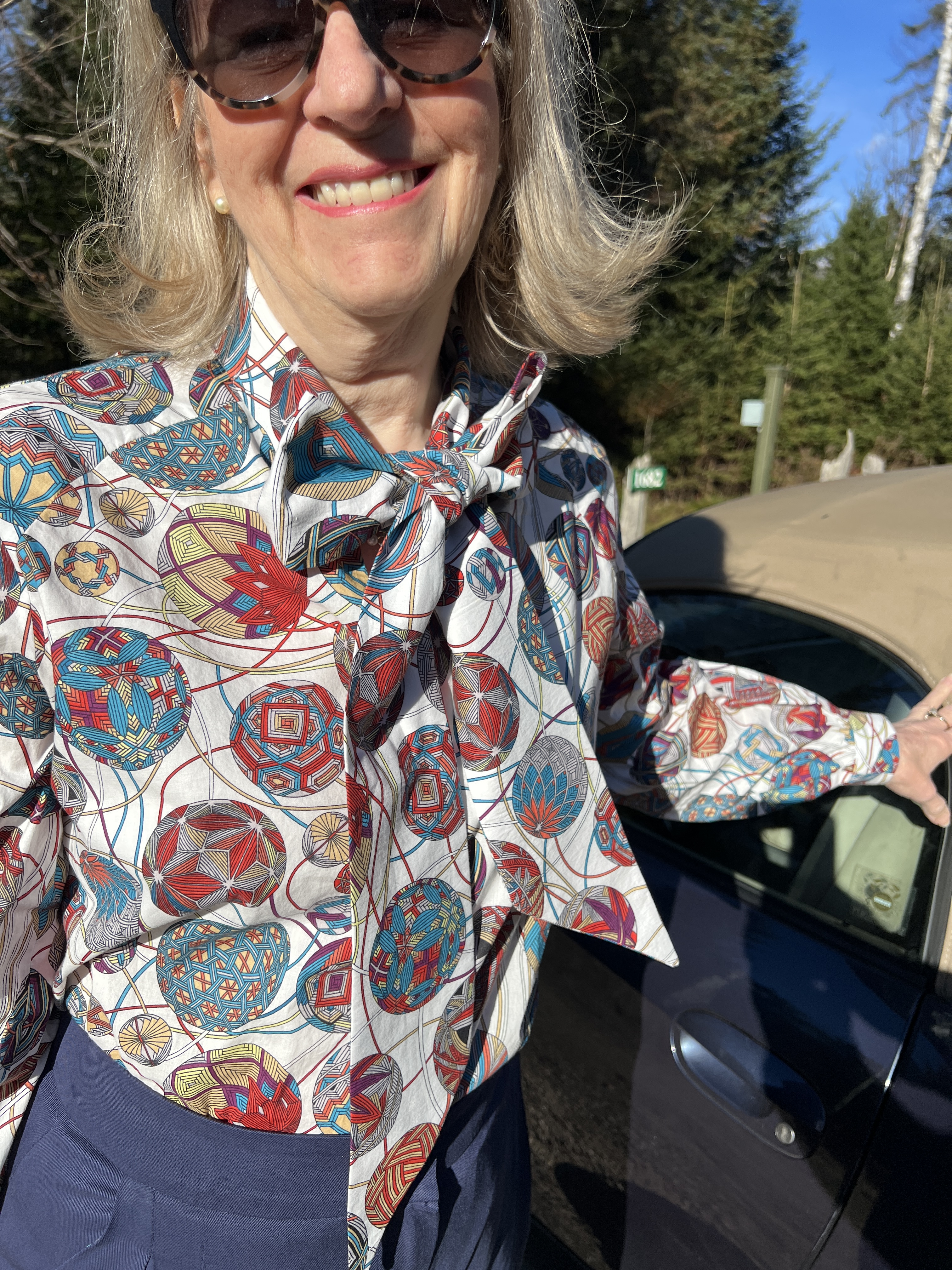 J’ai tombé en amour avec ce beau col lavallière que la créatrice portait sur Instagram et j’y voyais ce fameux tissu balle de laine en voile de coton style Liberty et très soyeux dedans.