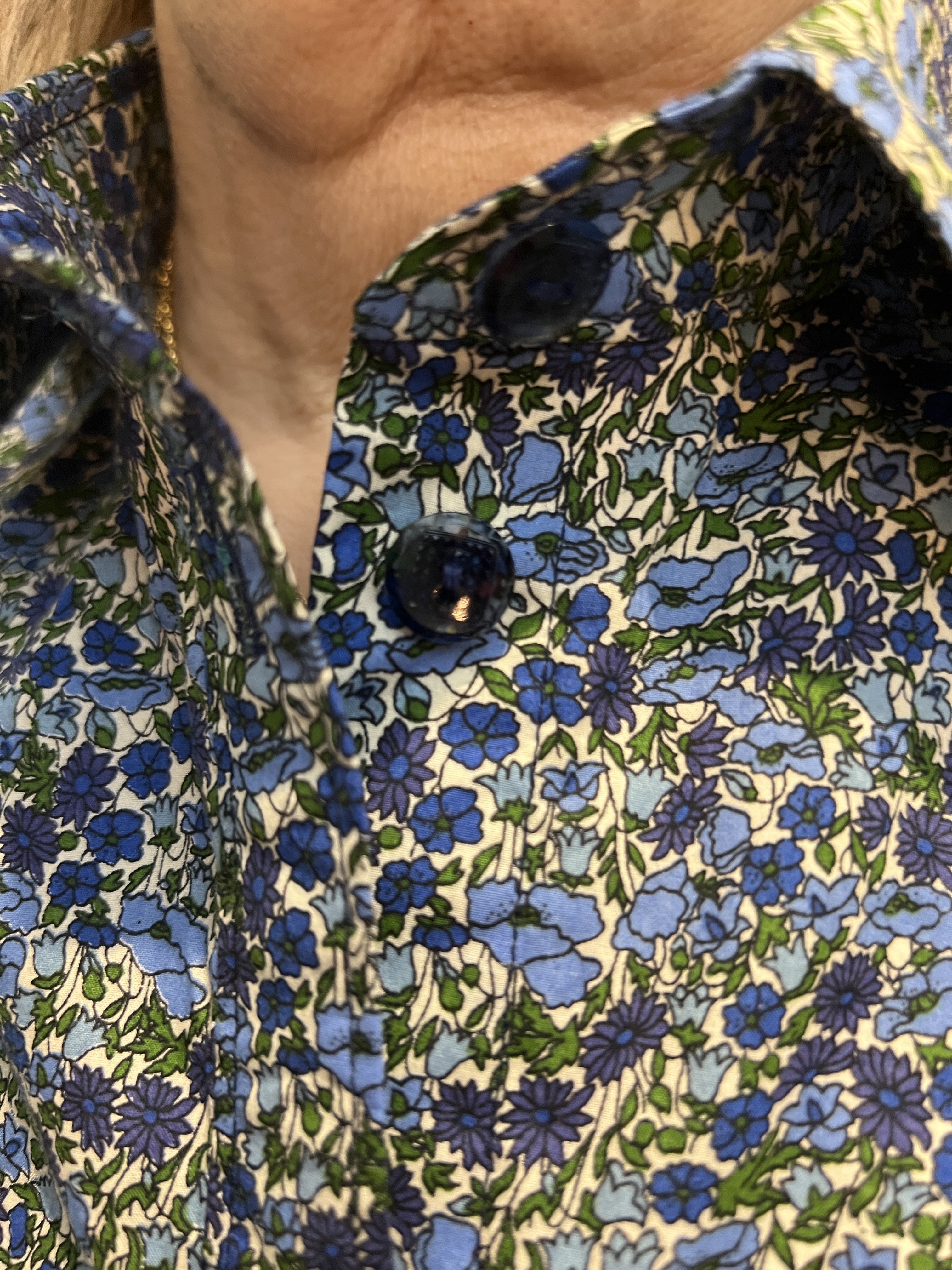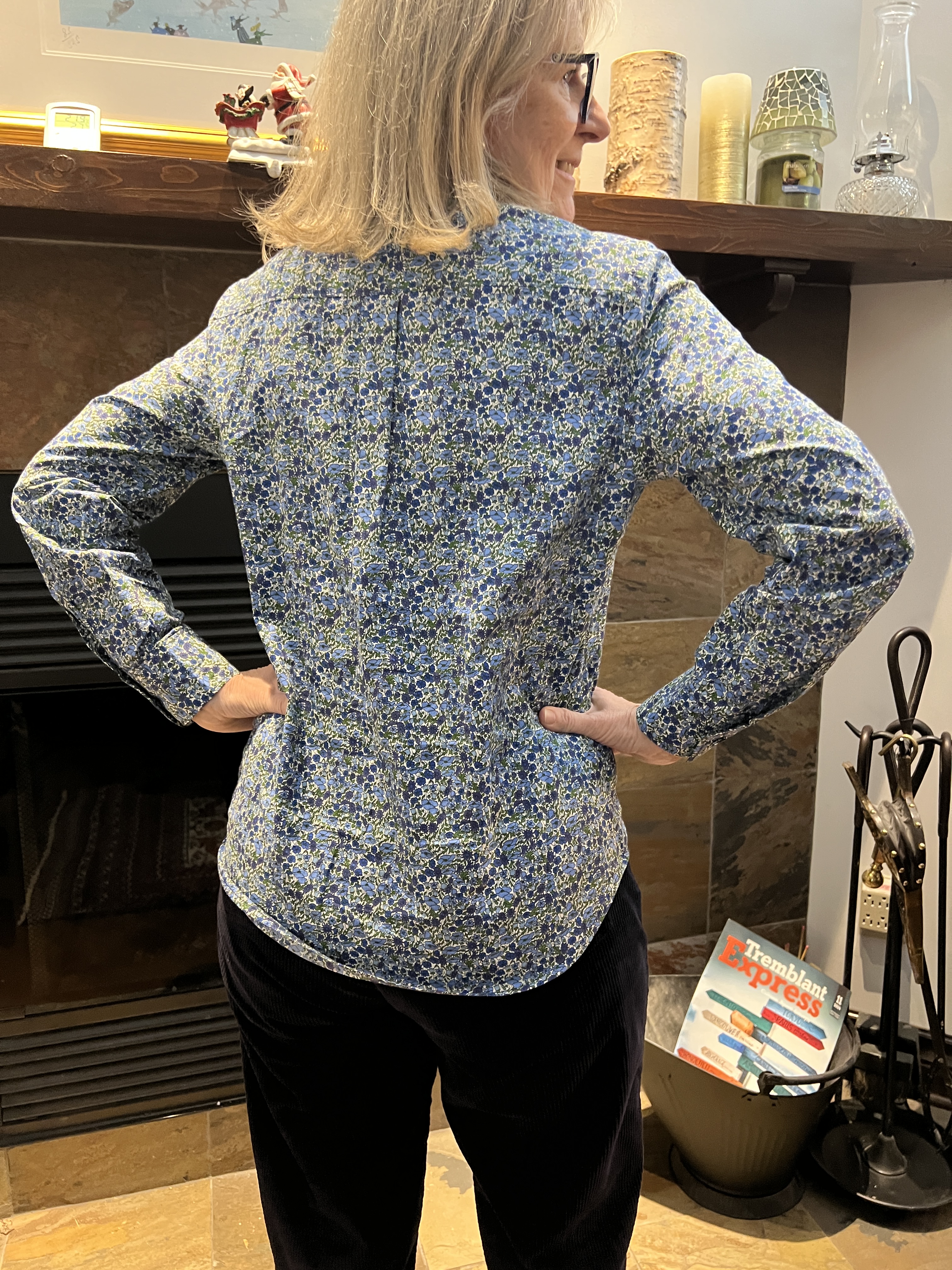 Nouvelle astuce que je vous rajoute! J’ai entoilé une des pièces d’empiècement dos et coupé l’autre, celle sur l’endroit, dans le biais afin de ne pas a avoir à faire coordonner les raccords qui sont minimes mais tout de même présents sur cet imprimé. D’ailleurs, au devant et à côté, ils sont tous bien alignés comme je les aime. La chemise, dans ce tissu si fin de popeline, a plus de tenue sur les épaules et se reflète ensuite sur le corps. Alain me confirme le confort de cette astuce.Bien fière de mon coup!