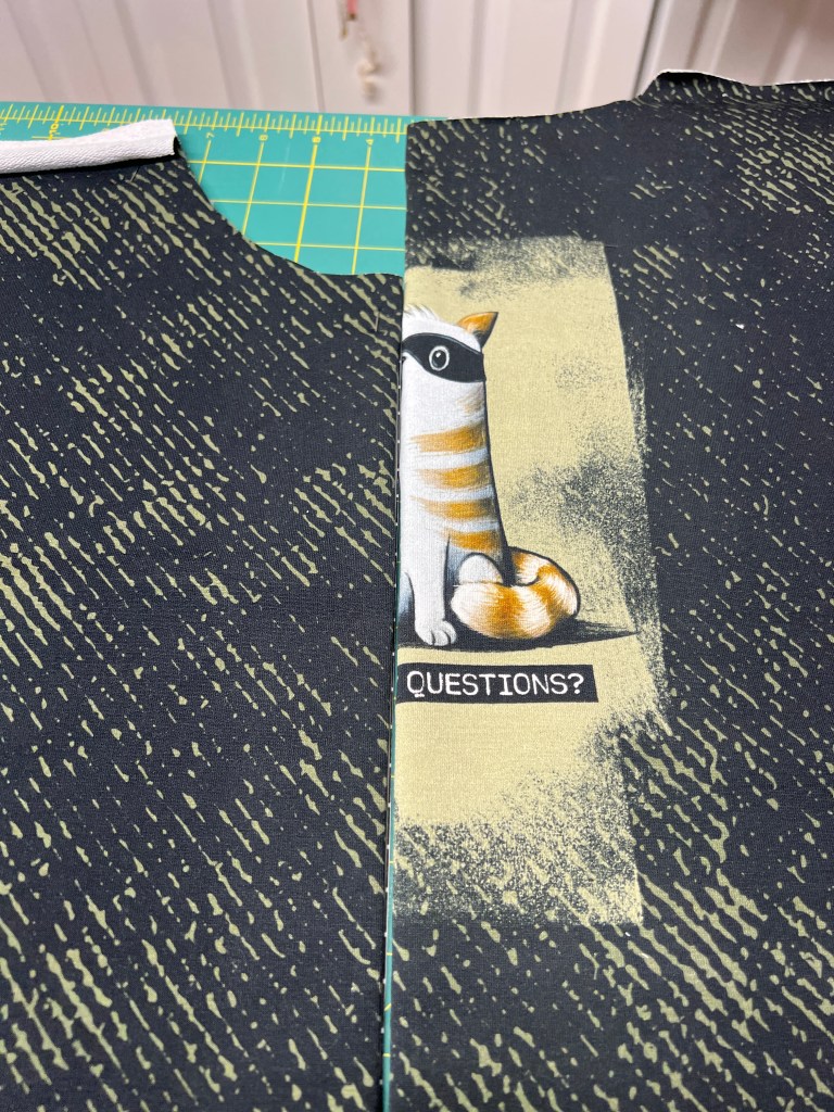 En catastrophe, (le propriétaire de la boutique a dû me trouver totalement cinglé…) j’ai recommandé immédiatement le panel afin de le recouper dans le bon sens cette fois-ci, en espérant qu’ils arrivent à temps. J’ai aussi repris 1/2 m du tissu qui va avec, après la suggestion d’Alain de ne pas le mettre à la poubelle, en me disant que je serai peut-être capable de lui faire un hoodie, pas de capuchon, et avec le chat dans le dos?