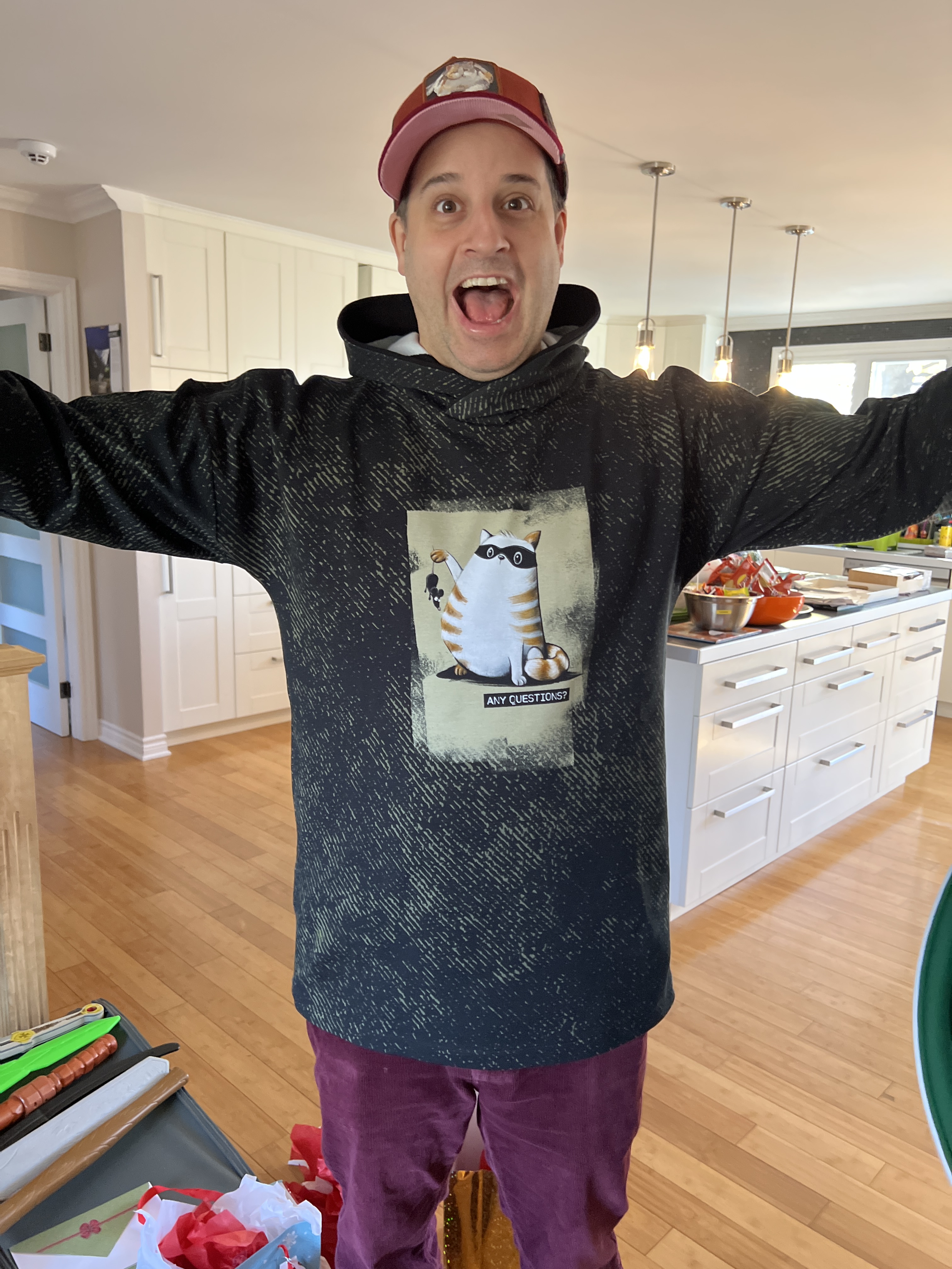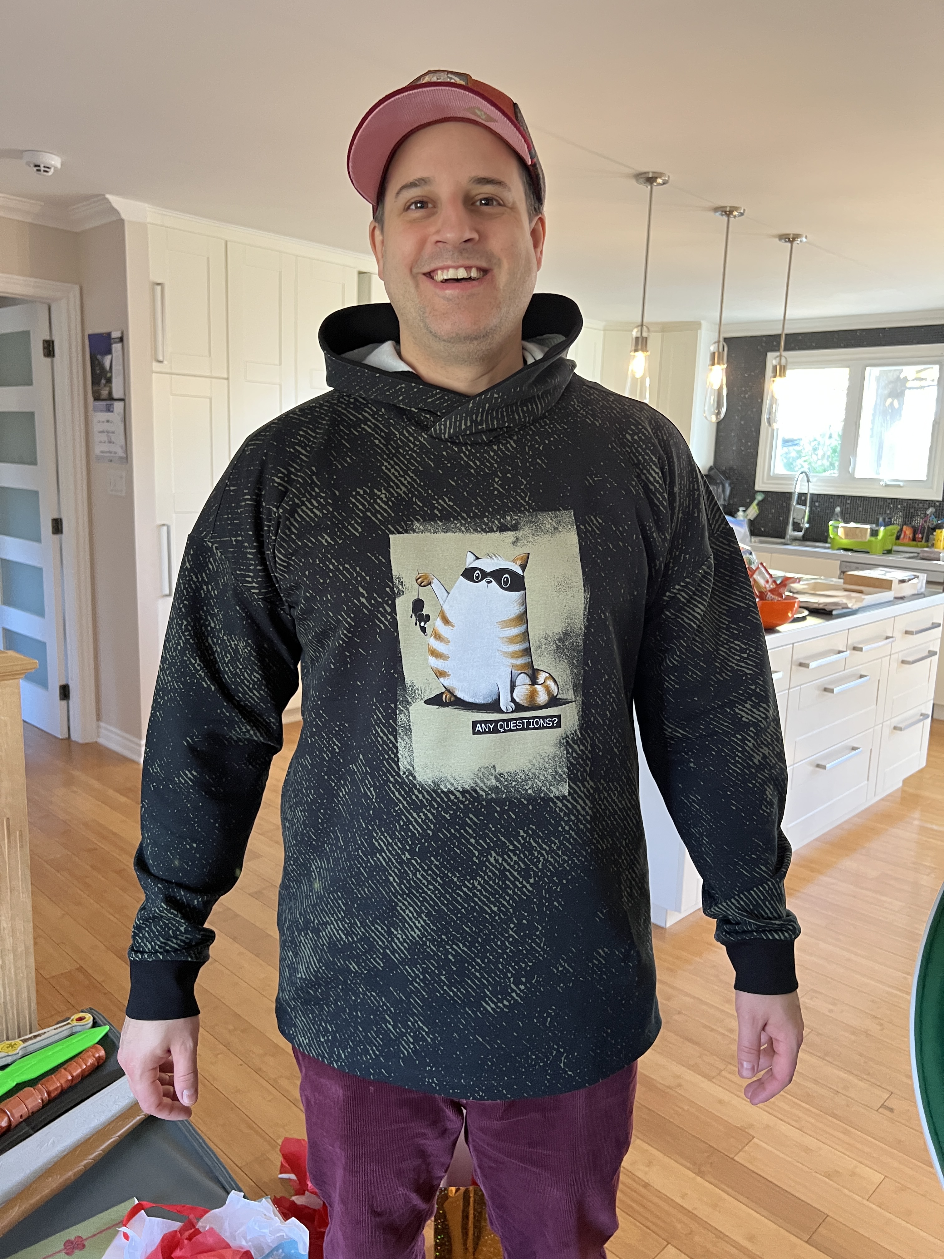 Après rachat de tissus et couture de nuit,🤪 voici le résultat : Gendre heureux avec son hoodie « Gaspard le gros chat » bien centré sur le devant! 😂😉