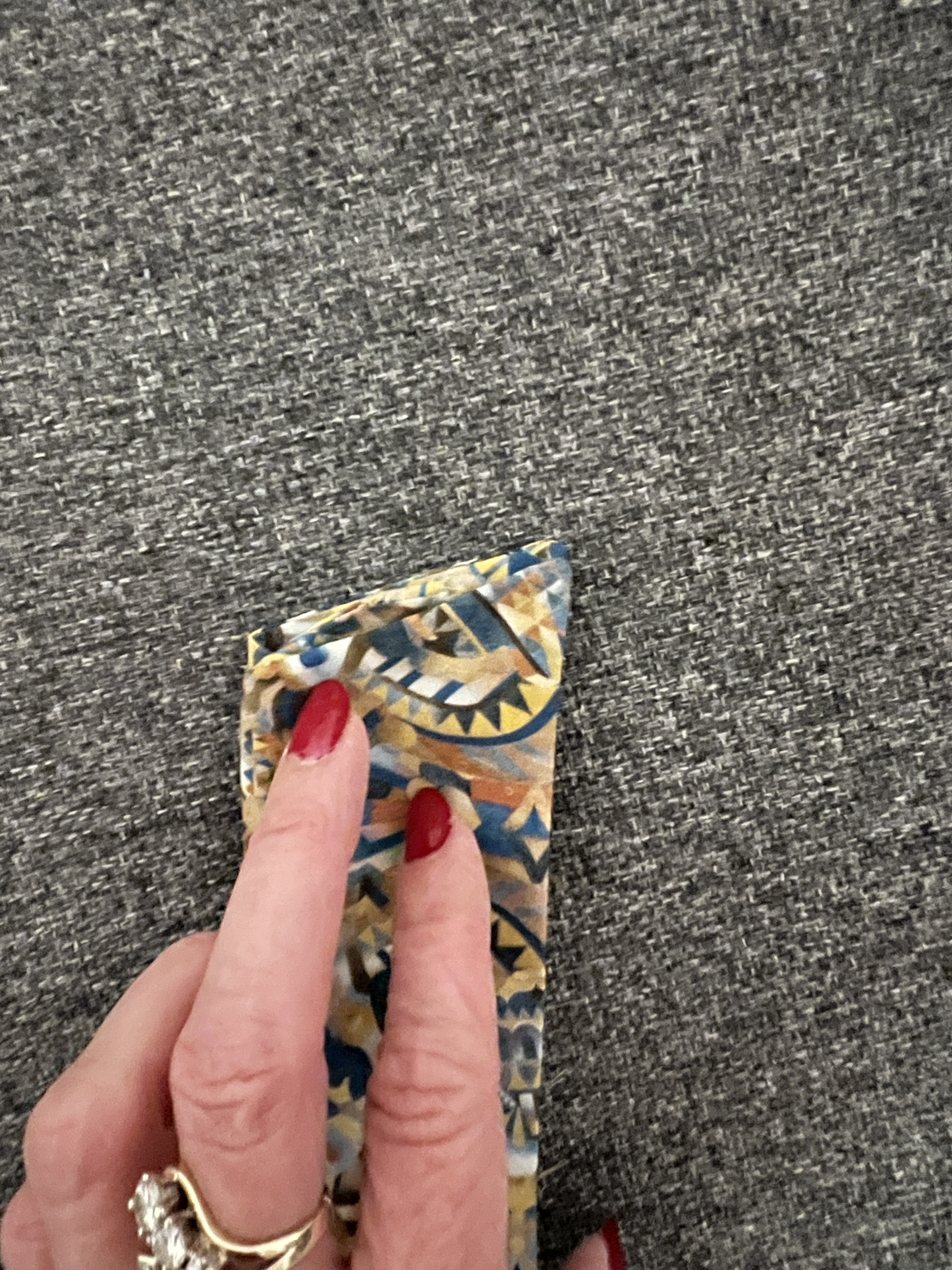 Dans ce tissu, elle est wow! J’aime toujours les coins en angles des bracelets de manches.