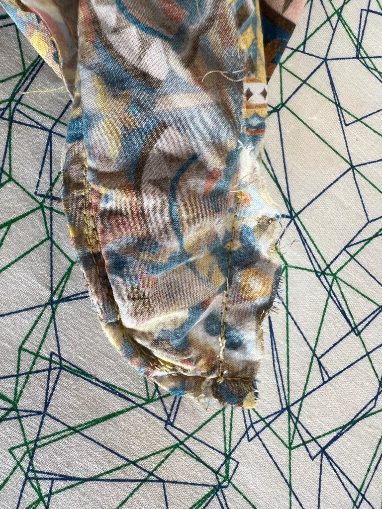 J’ai opté pour des pattes en faux biais qu’ils appellent fente indéchirable et qui sont tellement plus rapides, mais j’en ai profité pour lui mettre une petite touche qui démontre son unicité à cette jolie chemise. Vous reconnaissez le tissus? 😉