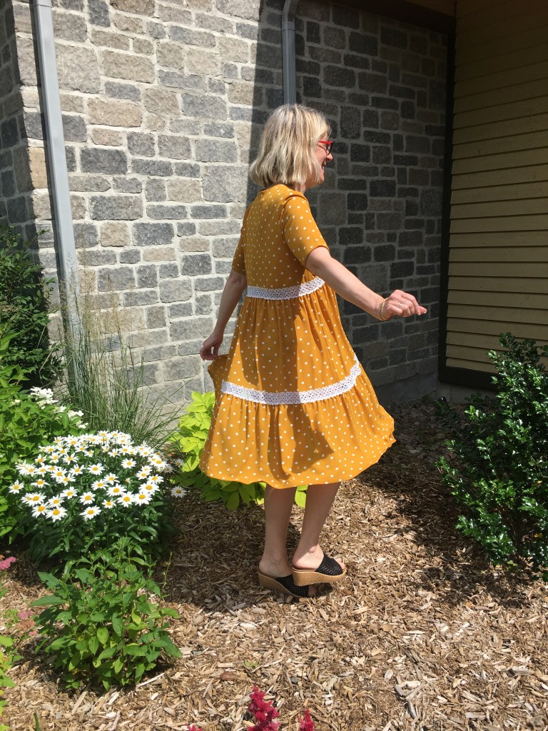En feuilletant ma revue de patron néerlandais Fibremood, j’étais tombé immédiatement en amour avec cette robe qui me rappelait mes robes « mi-paysannes/mi baby doll » de ma jeunesse. J’avais dans ma réserve le tissu parfait, une crêpe très souple et fluide. Même si c’est du polyester qui n’est pas dans mes matières favorites car en plus d’être pas très doux en texture crêpe ce tissu ne respire pas et n’est pas très écologique, mais… je trouvais les petits pois adorables dans ma couleur favorite du moment.